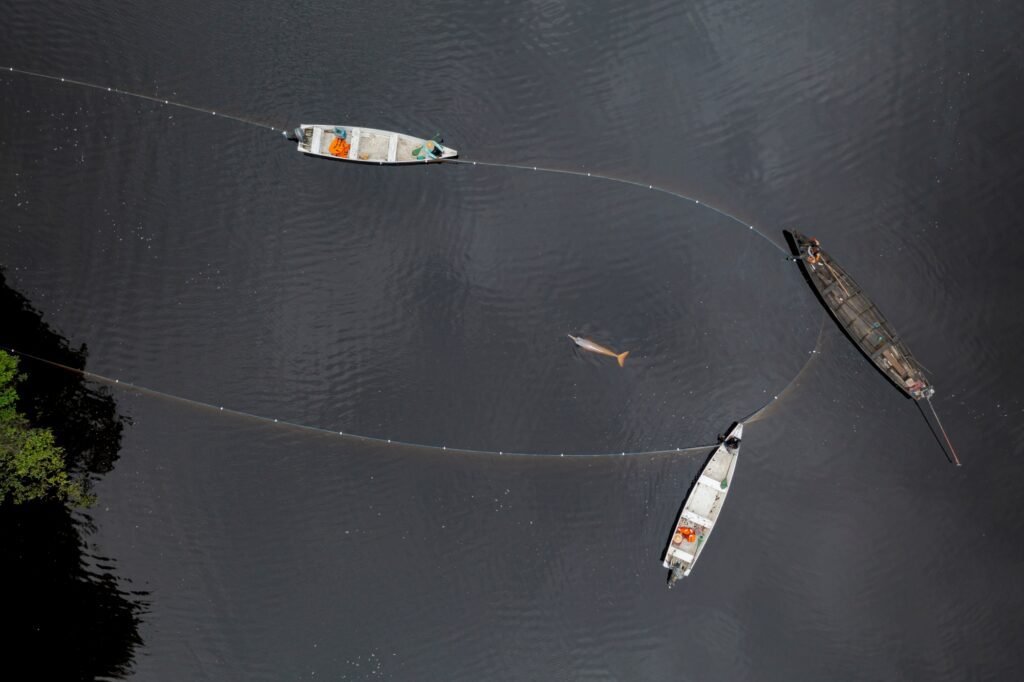 Boto-vermelho dentro de cerco com malhadeiras no Lago Amanã, logo antes de captura científica. Fotos: Miguel Monteiro