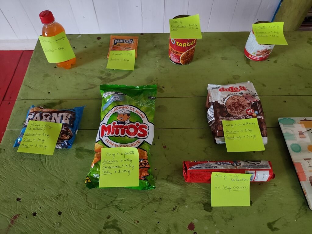 Nas oficinas, os comunitários aprenderam a identificar as informações nutricionais em embalagens de produtos ultraprocessados. Crédito: Daiane da Rosa